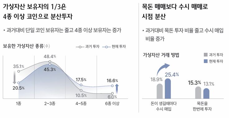 지난해 부유층의 3분의 1은 가상자산을 보유하고 있거나 보유 경험이 있는 것으로 파악됐다. 가상자산 투자자 10명 중 3명(34.0%)은 4종 이상 코인을 보유하고 있었으며, 목돈을 한 번에 투자하기보다 수시로 매입하는 경향도 높아졌다. 가상자산에 1000만 원 이상을 투자하는 부유층의 비율이 70%를 넘었고 평균 투자액은 과거 투자자보다 두 배 이상 많아졌다.