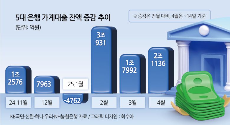 대신 작년 말부터 줄곧 내림세를 보였던 신용대출이 4월 들어 5개 은행에서 일제히 늘며 1조원 이상 증가했다. 연말·연초 상여금으로 대출을 상환하는 등의 계절적 요인 감소에 미국의 관세 정책 영향으로 국내외 증시가 급등락하면서 주식을 저가 매수하려는 투자 수요가 있었다는 분석이 나온다. 한국거래소에 따르면 지난 1~14일 개인 투자자는 국내 증시에서 5조2360억원을 순매수했다.