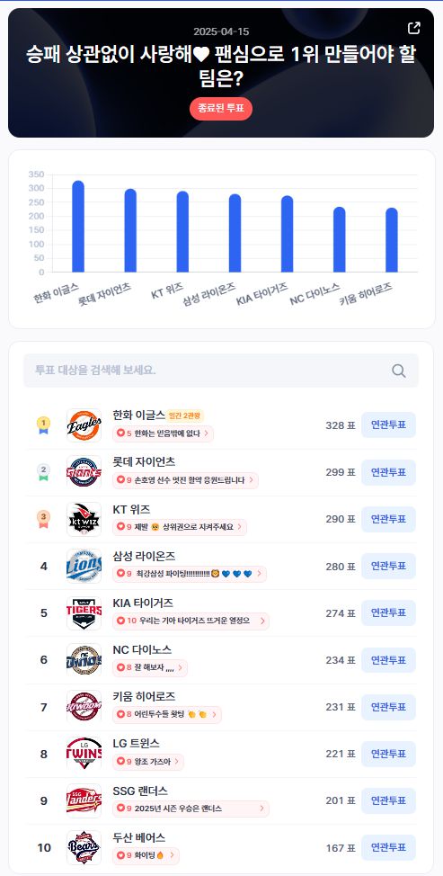 이번 투표에서 1위는 한화 이글스(328표)가 차지했다. "하늘도 한화팬이다☁️"라는 메시지처럼, 한화 팬덤의 열기는 압도적이었다. 2위에는 롯데 자이언츠(299표), 3위는 KT 위즈(285표), 4위 삼성 라이온즈(280표), 5위는 KIA 타이거즈(274표)로 집계되며, 전통 강호들과 신흥 강자의 팬심이 고루 분포된 결과를 보였다.