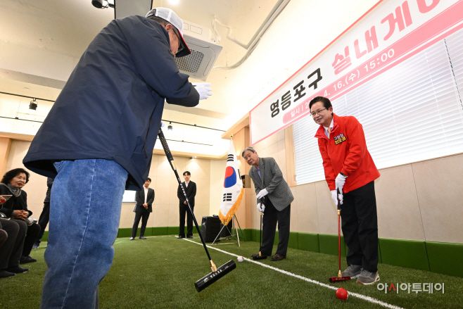 최호권 영등포구청장이 16일 오후 서울 영등포구 옛 신길3동 주민센터에 새롭게 조성된 '영등포구 실내게이트볼장' 개장식에서 한효섭 영등포구 게이트볼협회장으로부터 기본 자세를 배우고 있다. 영등포구는 구민의 건강한 여가생활을 위해 첫 실내 생활체육 공간으로 게이트볼장을 조성했다. 상반기부터 실내 파크골프장 7개소도 개장해 실내 생활체육 환경을 확대해 나갈 예정이다. /정재훈 기자 |