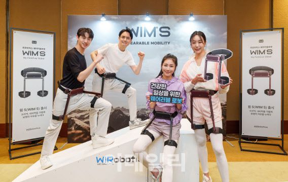 16일 서울 용산구 그랜드 하얏트 서울에서 열린 위로보틱스 홍보 모델들이 개인용 보행보조 웨어러블 로봇 ‘윔S(WIM S)’을 착용하고 시연하고 있다.(사진= 위로보틱스)