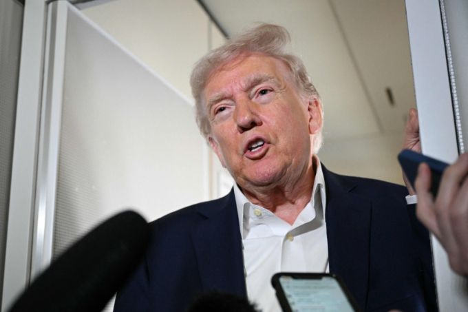 도널드 트럼프 미국 대통령이 11일(현지시간) 플로리다주 웨스트 팜비치에 있는 팜비치 국제 공항으로 이동하는 기내에서 취재진과 만나 “관세 협상에 대해 많은 나라와 대화를 하고 있다. 우리는 매우 좋은 위치에 있다"고 밝히고 있다. 2025.04.13 /AFPBBNews=뉴스1 |
