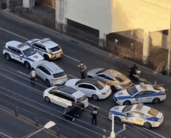 또 영상에는 벤츠 운전자가 먼저 앞을 막은 승용차에 힘껏 돌진하는 모습도 담겼다. 다만 전면에는 두 대가 버티고 있었고 그 과정에서 벤츠 앞쪽으로 다가가던 한 경찰관이 받힐 뻔한 장면도 연출됐다. 벤츠 운전자는 수차례 앞뒤로 왔다 갔다 반복하며 차량을 받았으나 벤츠를 둘러싼 차들이 더 가깝게 압박했다.
