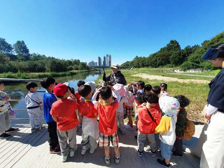 수질 개선 후 명품 하천으로 재탄생한 승기천에 학생들이 찾아 견학하고 있다.[인천 연수구 제공] |