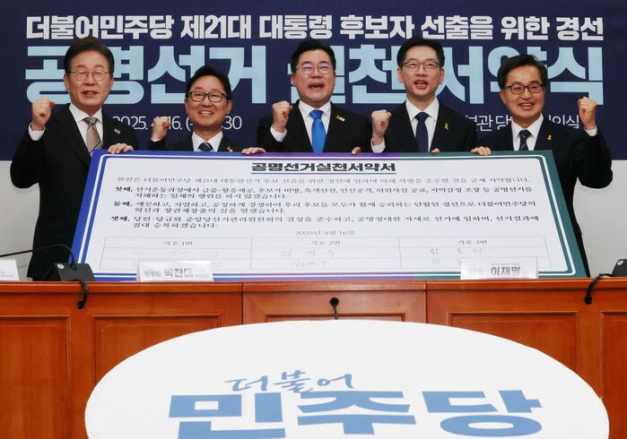민주당 지도부도 이번 경선이 진흙탕 싸움이 되지 않을 것으로 예상은 하지만, 지난 대선 과정의 '명낙대전'과 같은 과열과 분열이 재연되지 않도록 미리 주의를 주는 차원에서 서약식을 연 것으로 볼 수 있습니다.