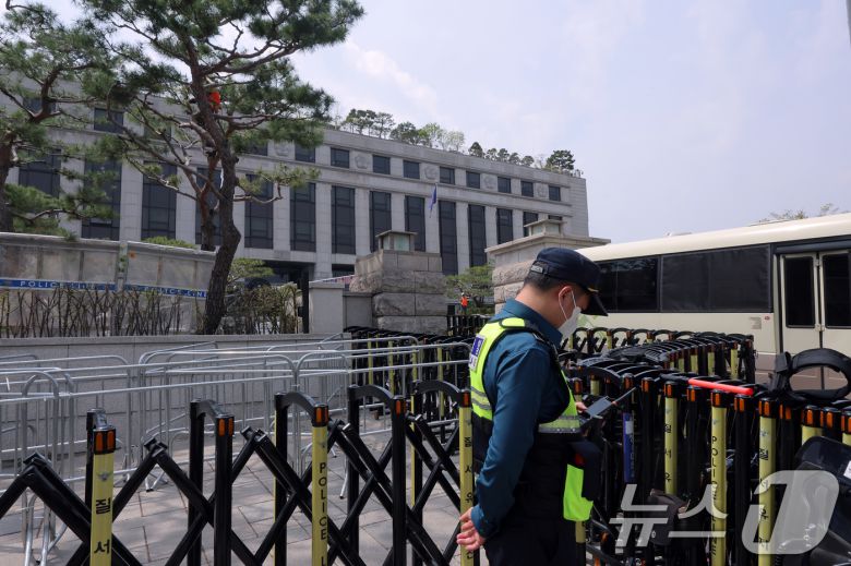 문형배 헌법재판소장 권한대행과 이미선 헌법재판관의 퇴임을 앞두고 한덕수 대통령 권한대행 국무총리의 재판관 지명 효력정지 가처분 결론에 이목이 집중되고 있는 16일 오후 서울 종로구 재동 헌법재판소 앞에서 경찰이 경계 근무를 서고 있다. 한덕수 권한대행이 이완규 법제처장과 함상훈 서울고법 부장판사를 지명한 것을 놓고 권한쟁의심판과 헌법소원, 효력 정지 가처분 등이 신청되자 헌법재판소는 이 사건들에 대해 마은혁 재판관을 주심으로 선정한 뒤 정식 심판 절차에 회부하고 논의에 속도를 내고 있다. 2025.4.16/뉴스1 ⓒ News1 박정호 기자 |