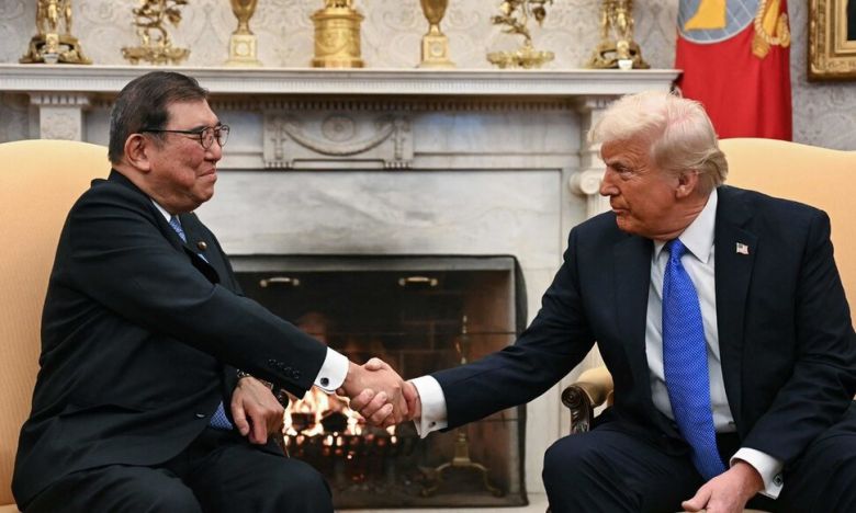 도널드 트럼프 미국 대통령(오른쪽)이 2월7일 백악관 오벌 오피스에서 일본 총리 이시바 시게루와 악수를 나누고 있다. 워싱턴/AFP 연합뉴스 |