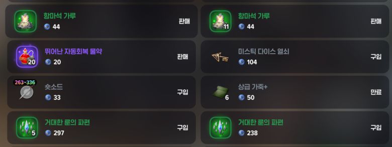 거대한 룬의 파편 및 항마석 가루는 공용 보관함으로 이동시킬 수 없지만, 거래소에 판매해 데카를 벌 수 있는 요긴한 재화다. 수요가 많고 가격도 제법 높게 형성됐다. 또한, 캐릭터 별로 퀘스트 보상으로 얻는 데카도 꽤 많은 편이다.
