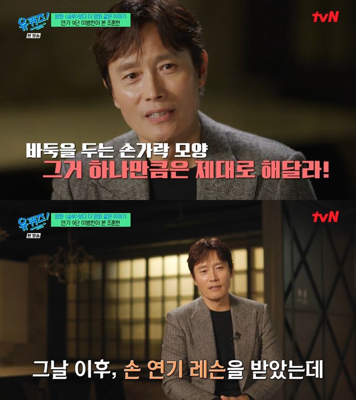 이날 이병헌은 자신이 출연한 영화 ‘승부’의 모티브가 된 조훈현을 지원 사격하기 위해 인터뷰로 등장했다. 이병헌은 “영화 시사회 날 (조훈현이) 왔더라. 온다는 말을 못 들어 놀라서 인사했는데 ‘예고편 보고 나인 줄 알았다’고 하더라. 그 말이 굉장히 기분 좋았다”고 웃었다.