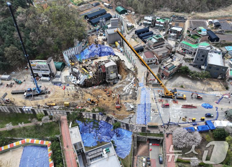 16일 경기 광명시 일직동 신안산선 복선전철 5-2공구 붕괴 현장에서 소방관 등 관계자들이 실종자 수색 작업을 이어가고 있다. 2025.4.16/뉴스1 ⓒ News1 이동해 기자