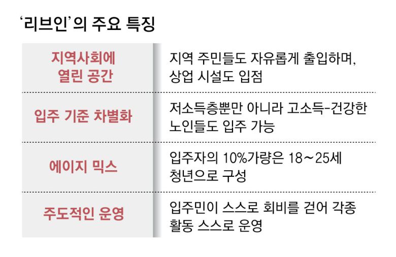 리브인은 역동성을 높이려 노인들의 입주 기준도 차별화했다. 과거 요양원은 정부의 권고에 따라 저소득층 노인을 우선적으로 받아들였다. 하지만 리브인은 고소득자도 입주해 입주자의 소득 수준이 다양하다. 세입자 가운데 유주택자가 약 40%에 이른다.