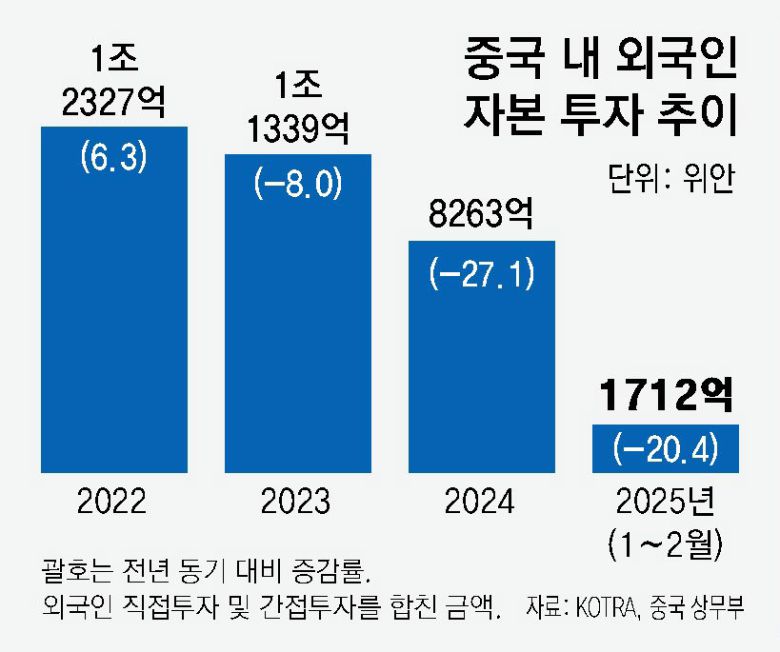 외국 기업의 탈중국 러시에 따라 외국인의 중국 투자는 빠르게 줄고 있다. 중국 상무부에 따르면 올 1, 2월 대중국 외국인 자본 투자 규모는 1712억 위안(약 33조3000억 원)으로 전년 동기 대비 20.4% 줄었다. 이는 외국인직접투자(FDI)와 간접투자를 합친 금액이다.