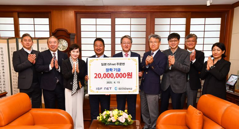 이날 오후 총장실에서 열린 장학금 전달식에는 ISFNET의 와타나베 유키요시 회장을 비롯해 모또무라 부사장, 허옥인 한국법인 대표, 김성은 국제협력본부장과 함께 영진전문대 최재영 총장, 류용희 컴퓨터정보계열 부장 등이 참석했다.