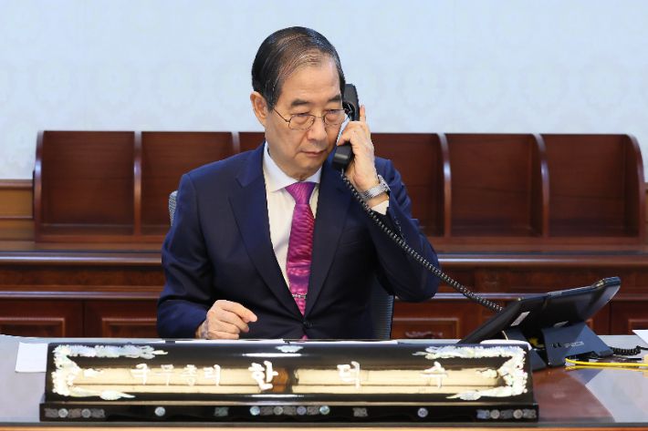 한덕수 대통령 권한대행 국무총리가 8일 정부서울청사 집무실에서 도널드 트럼프 미국 대통령과 전화 통화를 하고 있다. 총리실 제공