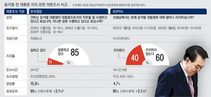 그런데 채 한 달도 지나지 않아 ‘윤석열 대통령을 어느 정도 지지하십니까’라고 묻는 다른 기관의 여론조사 결과가 나오기 시작했다. 윤 전 대통령 지지자들은 “지지율 40%를 넘었다”고 환호했다. 더불어민주당은 “명태균식 여론조사”라며 조사기관이 특정 답변을 유도했다고 비판했다.
