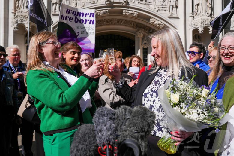 16일(현지시간) 영국 런던 대법원 밖에서 스코틀랜드 여성단체 '포 우먼 스코틀랜드'(For Women Scotland·FWS) 활동가인 스전 스미스와 마리오 칼더가 샴페인 잔을 부딪히고 있다. 이날 대법원은 영국 평등법의 여성이 생물학적 여성을 의미한다고 판결했다. 2025.04.16 ⓒ 로이터=뉴스1 ⓒ News1 김지완 기자 |