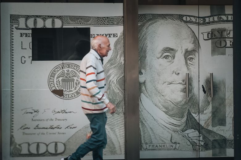 1일(현지시간) 아르헨티나 부에노스아이레스에서 한 시민이 달러 지폐가 크게 그려져 있는 환전소를 지나가고 있다. [EPA]