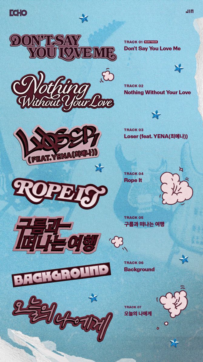 진은 17일 0시(이하 한국시간) 팀 공식 사회관계망서비스(SNS)에 미니 2집 ‘에코’(Echo)의 트랙리스트를 게재했다. 이번 앨범에는 타이틀곡 ‘돈트 세이 유 러브 미’를 비롯해 ‘낫띵 위드아웃 유어 러브’(Nothing Without Your Love), ‘루저’(feat. YENA(최예나)), ‘로프 잇’(Rope It), ‘구름과 떠나는 여행’, ‘백그라운드’(Background), ‘오늘의 나에게’ 등 총 7곡이 수록됐다.