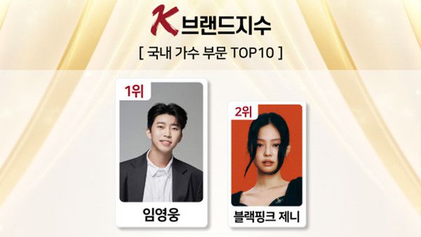 빅데이터 평가 기관 아시아브랜드연구소가 17일 발표한 'K-브랜드지수' 국내 가수 부문을 보면 임영웅이 1위, 블랙핑크 제니가 2위, 지드래곤 3위, 방탄소년단 제이홉 4위, 아이유 5위를 각각 차지했다.