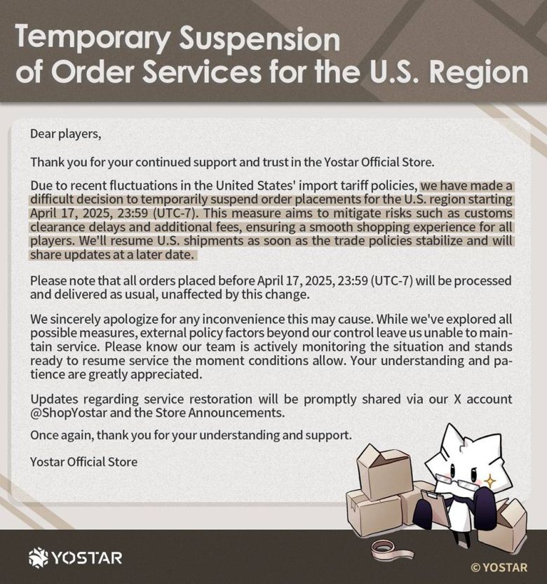 ‘명일방주’, ‘벽람항로’ 등을 서비스하는 중국 게임사 요스타가 자사의 스토어인 ‘요스타 스토어’에서 미국 지역 주문 서비스를 일시 중단한다고 밝혔다. 이에 미국 거주 이용자들은 한시적으로 요스타 스토어를 통해 판매되는 키링, 인형, 피규어, 아크릴 스탠드 등 게임 캐릭터 상품 굿즈들을 구매할 수 없게 된다. 단, 2025년 4월 17일 이전에 접수된 주문은 이번 정책 변경과 무관하게 배송될 예정이다.