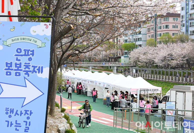 17일 서울 은평구 불광천에서 제45회 장애인의 날 기념 '은평봄봄축제'가 진행되고 있다. 은평구는 불광천 수변무대에서 장애인의 날 기념식을 시작으로 장애인과 비장애인 함께 참여하는 소통과 화합의 장인 '은평봄봄축제'를 개최한다. 직업재활생산품 판매 및 홍보와 다양한 체험부스가 신흥상가교부터 두빛나래교까지 불광천 변을 따라 운영된다. 18일에는 장애인들이 하고 싶은 직업의 옷을 입고 축제 기념 퍼레이드와 핸드스피크, 댄스, 난타 등 초청공연이 펼쳐진다. /정재훈 기자