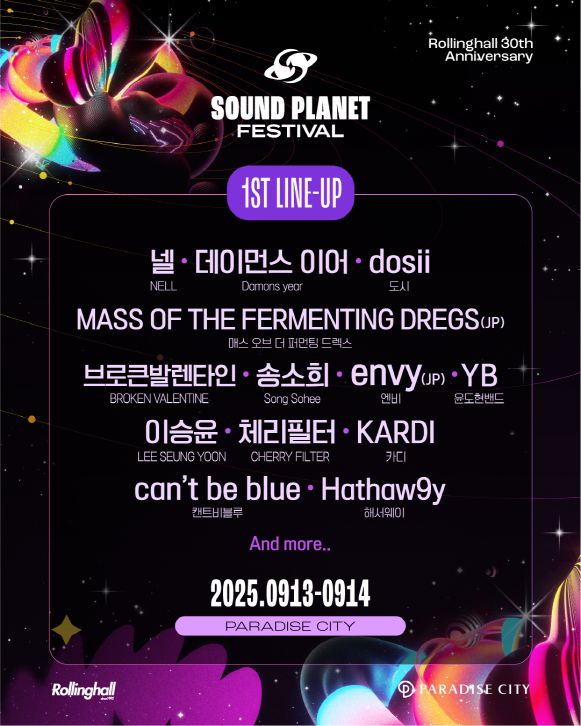 [스타데일리뉴스=천설화 기자] 홍대 음악의 성지 롤링홀이 개관 30주년 기념하여 첫 대형 페스티벌인 '2025 사운드플래닛 페스티벌(2025 SOUND PLANET FESTIVAL)'에 YB, 체리필터, 넬, 이승윤 등이 포함된 1차라인업이 공개됐다.