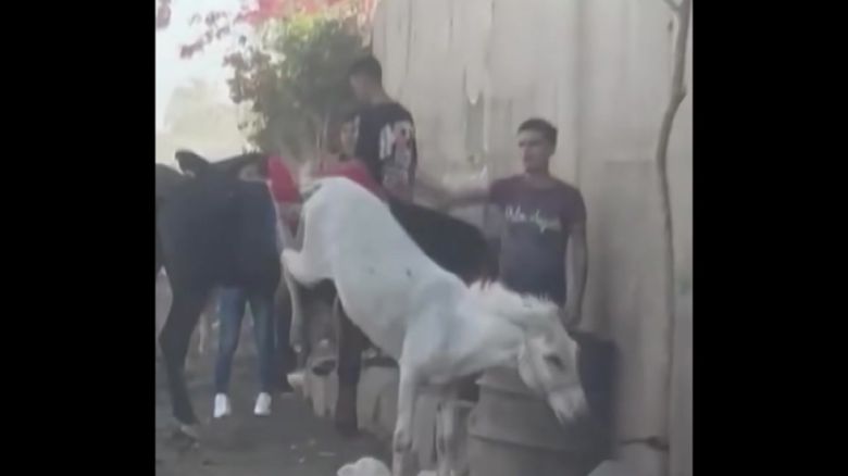 조련사가 묶인 당나귀에게 채찍을 가하고,