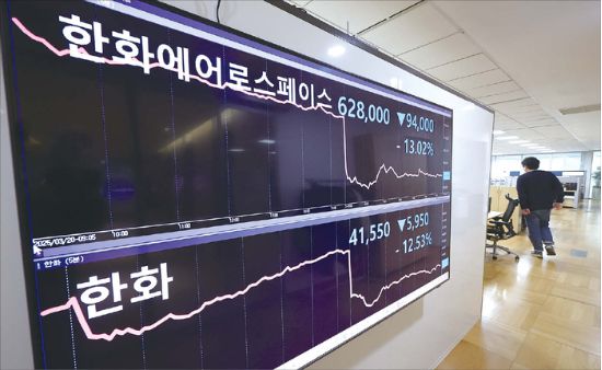 지난 3월 20일 한화에어로스페이스의 3조6000억원 규모 유상증자 결정 이후 한화그룹주가 동반 급락한 모습. 한화에어로스페이스 이사회는 3명의 사내이사와 4명의 사외이사로 구성돼 있는데, 모두 유상증자에 찬성했다. (연합뉴스) |