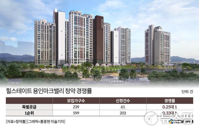 1순위 청약 전날 진행된 특별공급 역시 저조한 성적이다. 239가구 모집에 61명이 지원해 평균 경쟁률은 0.25대 1이다. 특히 용인 지역의 특별공급 청약자는 21명으로 청약 신청자의 3분의 1 수준에 불과했다.