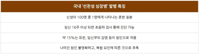 경희대병원 심장내과 김우식 교수는 "선천성 심장병의 10~15%는 유전과 임신 중 엄마의 풍진 바이러스 감염, 당뇨병, 알코올 섭취, 특정 약물 복용 등이 원인인 것으로 밝혀졌다"며 "하지만 약 85%는 아직 발병 원인이 불명확하고, 복합적인 요인이 작용한 것으로 생각한다"고 설명했습니다.