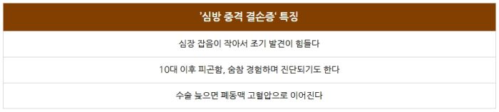 김우식 교수는 "때문에 대부분 자각 증상이 없다가 10대 이후 또는 성인기에 피곤함, 운동 시 숨참 등의 증상 등을 경험해서 진단받기도 한다"고 설명했습니다.