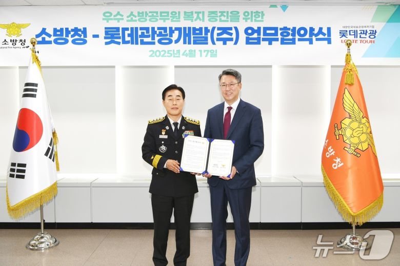 이날 오전 세종시 정부2청사에 자리한 소방청에서 백현 롯데관광개발 대표이사 사장과 허석곤 소방청장이 소방공무원을 위한 문화 복지 혜택을 지원하는 내용의 협약을 맺었다.