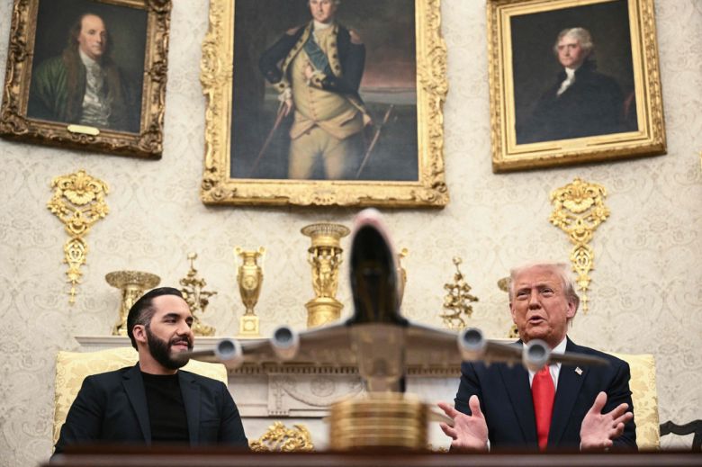 도널드 트럼프 미국 대통령이 지난 14일 워싱턴 백악관 집무실에서 나이브 부켈레 엘살바도르 대통령을 만나고 있다. 집무실이 온통 금빛으로 장식돼 있다. AFP연합뉴스 |