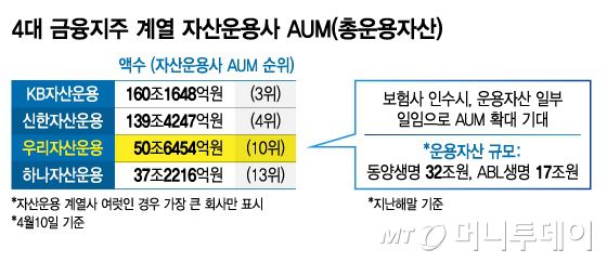우리금융그룹의 동양생명과 ABL생명 인수 기대감에 계열사 우리자산운용의 수혜 가능성도 커졌다. 우리자산운용은 보험사의 일반계정 자산을 일부 일임받으면 자산운용사의 총운용자산(AUM)이 늘고 시장 내 LDI(부채연계투자) 등 운용 경쟁력을 강화할 수 있다고 기대했다.