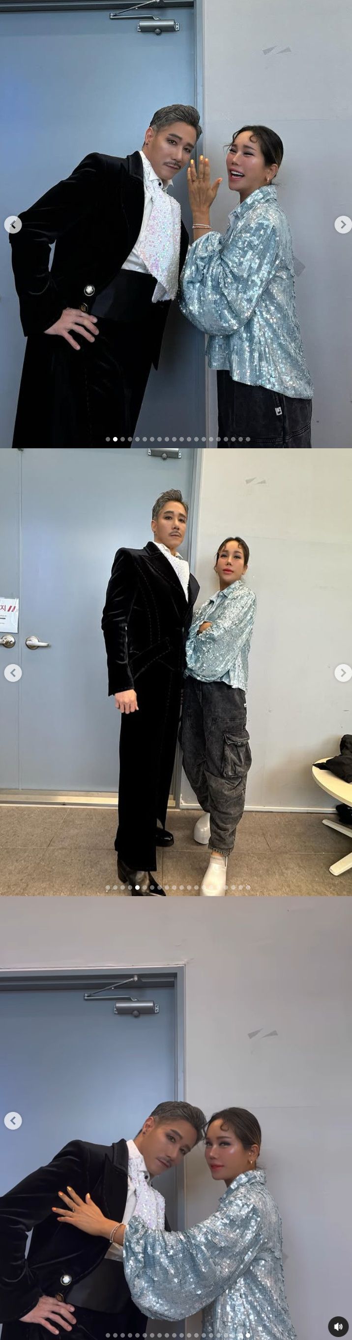 김송은 패션쇼 모델로서 쇼에 선 동생 김재현과 찍은 사진을 공개, 똑닮은 화려한 비주얼을 자랑했다.