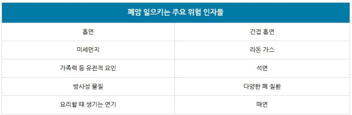 이외에 △미세먼지 △라돈 가스 △가족력 등 유전적 요인 △유전자 돌연변이 △석면 △방사성 물질 △다양한 폐 질환 △요리할 때 나오는 연기인 쿠킹흄 △매연 △간접흡연 등도 폐암에 영향을 주는 것으로 보고됩니다.
