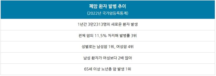 통계를 보면 2022년 한 해 폐암 환자는 3만2313명 발생해서 전체 암의 11.5%를 차지, 우리나라에서 세 번째로 많은 암에 이름을 올렸습니다.