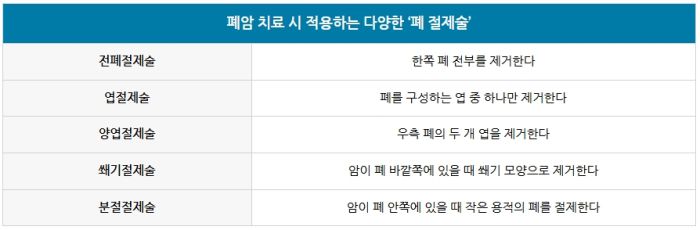 '수술’은 초기 폐암 환자의 완치율을 높이는 중요한 치료입니다. 수술은 다시 폐의 절제 부위와 범위에 따라서 △전폐절제술 △엽절제술 △양엽절제술 △쐐기절제술 △분절절제술 등으로 구분합니다.