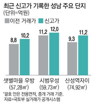 실제 분당에선 1기 신도시 재건축 선도지구(샛별마을·양지마을·시범우성·현대)를 중심으로 신고가가 속출하고 있다. 양지마을 6단지 금호청구는 지난달 29일 전용면적 59.94㎡가 10억3500만원에 신고가 거래됐다. 같은 달 양지마을 금호1단지 전용 84㎡도 17억7000만원에 팔리며 최고가를 찍었다.