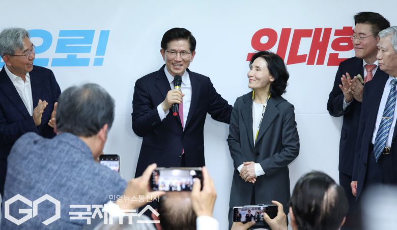 (서울=국제뉴스) 김문수 국민의힘 대선 경선 후보가 17일 오후 서울 여의도 대하빌딩에서 열린 선거사무소 개소식에서 부인 설난영 씨를 소개하고 있다./사진=이용우 기자