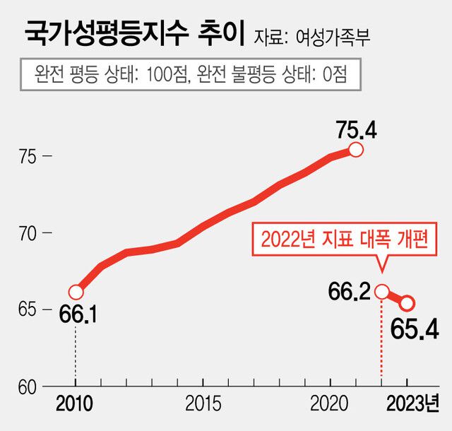 여성가족부가 17일 발표한 2023년 국가성평등지수는 65.4점으로 전년 66.2점보다 0.8점 하락했다. 이 지수는 고용·소득·건강·교육·돌봄·양성평등의식·의사결정 등 7개 영역에서 관련 통계를 취합해 23개 지표로 산출해 만든다. 100점(완전 성평등)에 가까울수록 평등하며, 0점에 가까울수록 성불평등이 심각하다는 뜻이다.