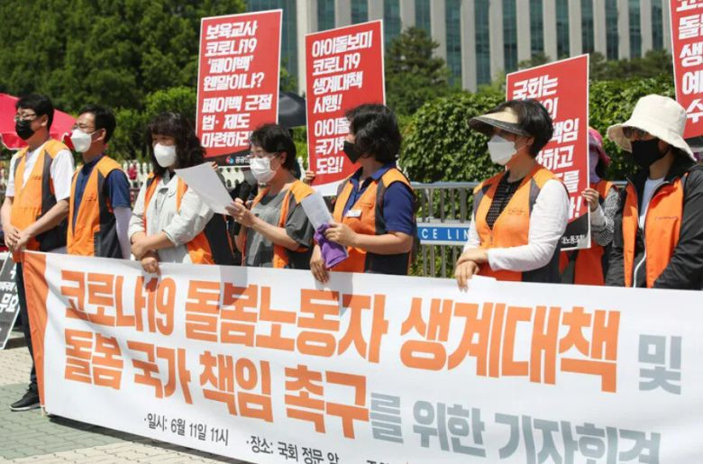 지난 2020년 6월11일 서울 여의도 국회 앞에서 ‘코로나19 돌봄노동자 생계대책 및 돌봄 국가 책임 촉구를 위한 기자회견’이 열리고 있다. 연합뉴스
