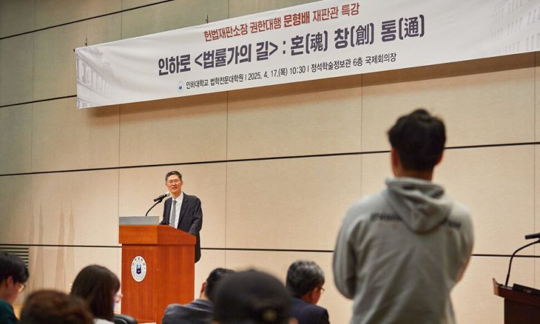 17일 인하대학교 법학전문대학원에서 ‘법률가의 길: 혼, 창, 통’을 주제로 강연한 문형배 헌법재판소장 권한대행. 인하대 제공 |