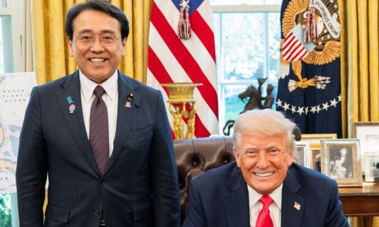 트럼프 “日 관세협상단과 큰 진전” 도널드 트럼프 미국 대통령(오른쪽)이 16일(현지시간) 워싱턴 백악관 집무실에서 관세 협상을 위해 미국을 방문한 아카자와 료세이 일본 경제재생상을 만나 기념촬영을 하고 있다. 트럼프 대통령은 일본 협상단과의 만남 후 ‘큰 진전(Big Progress)을 이루었다’는 글을 자신의 소셜미디어에 올렸다. 트루스소셜 캡처