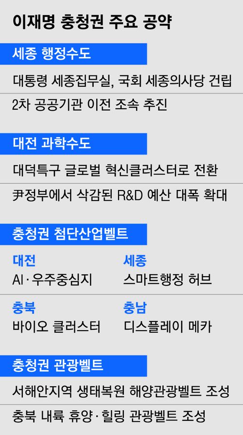 충청권의 성장동력을 더 키우겠다는 포부도 밝혔다. 대전·세종·충북·충남을 잇는 첨단산업벨트 구축을 제시한 것이다. 대전 대덕연구특구는 인공지능(AI)과 우주산업 중심지로 키우고, 세종은 스마트·디지털 행정 허브로 구축한다는 구상이다. 충북은 바이오 산업, 충남은 미래형 디스플레이 산업 중심지로 만들 예정이다. 환황해권 해양관광벨트와 충북 휴양·힐링 관광벨트 조성도 밝혔다.