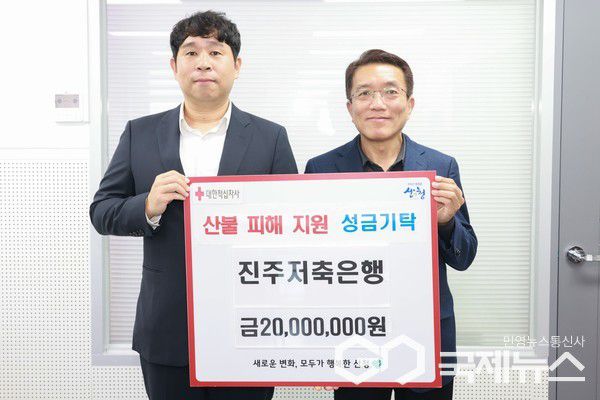 (진주=국제뉴스) 구정욱 기자 = 진주저축은행이 산청과 하동에서 발생한 대형 산불로 인해 큰 피해를 입은 지역주민들을 지원하고, 이들의 빠른 일상 복귀를 돕기 위해 17일 양 지자체에 총 4천만 원의 기부금을 전달했다.