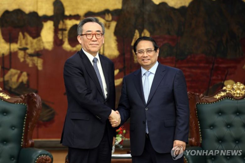 베트남 하노이를 방문한 조태열 외교부 장관(왼쪽)이 지난 16일(현지시간) 팜 민 찐 베트남 총리와 만나 악수하고 있다. 연합뉴스 |