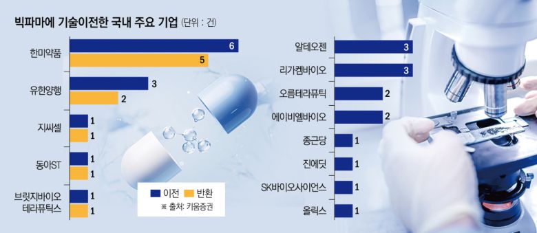 국내 기업 중 빅파마와 가장 많은 계약을 한 곳은 한미약품으로 총 6건의 기술이전을 했다. 2015년 한 해에만 일라이릴리, 베링거인겔하임, 사노피, 얀센과 계약했고 2016년 제넨텍, 2020년 미국 머크(MSD)와 손을 잡았다. 유한양행‧알테오젠‧리가켐바이오사이언스가 3건, 에이비엘바이오‧오름테라퓨틱이 2건으로 뒤를 이었다.
