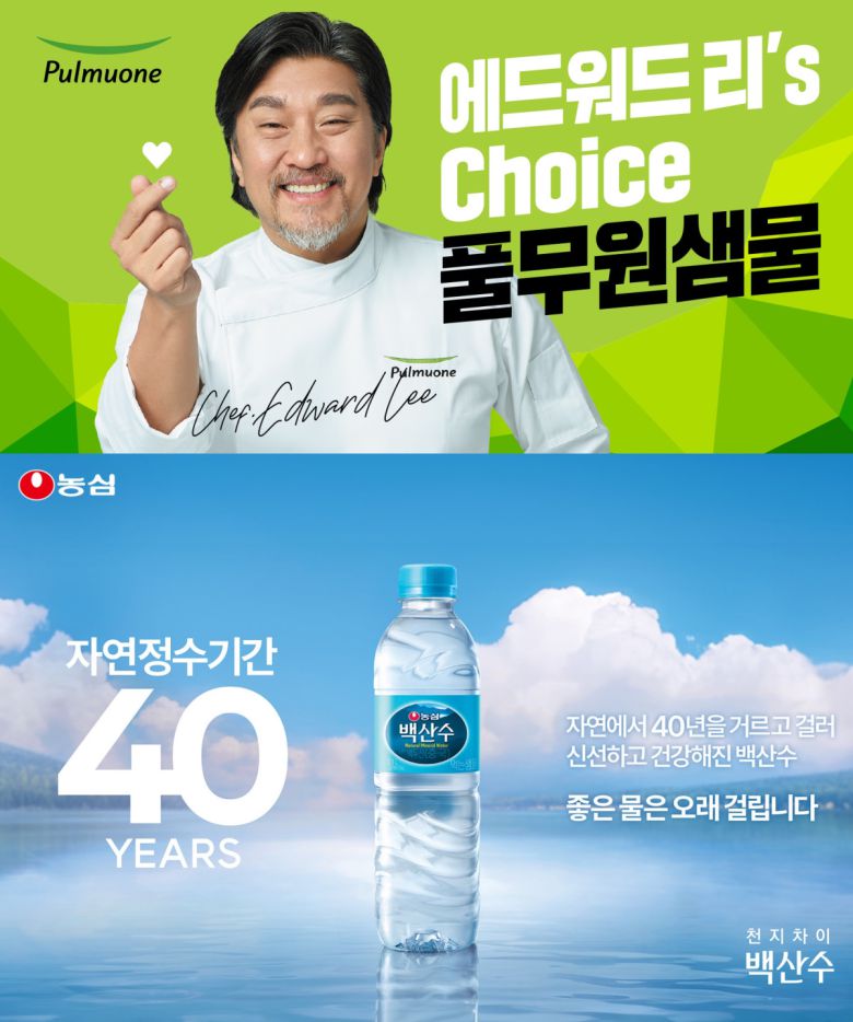 풀무원샘물(위)과 농심 백산수의 신규 광고 캠페인. |