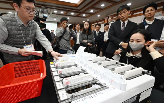 이날 시연회장에는 지난해 도입한 신형 투표용지분류기도 등장했다. 투표지를 후보별로 자동 분류하는 장치다. 기표란을 조금 벗어난 애매한 표도 잡아낸다. 분류기 끝쪽엔 제어용 PC(노트북)가 달려 있는데, 음모론자들은 해킹 가능성을 끊임없이 제기한다. 김승주 고려대 정보보호대학원 교수는 “제어용 PC에 통신 기능 자체가 없어 외부에서 원격으로 해킹한다는 건 불가능하다”고 말했다. 2021년 감사원이 감사를 벌였는데 개표 작업 이후 PC 내 통신 기능을 뜯어낸 것으로 추정되는 어떤 흔적도 발견되지 않았다.